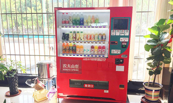 在用户休息区的一侧设置了饮料自动售卖机,旁边还放置了热水桶,贴心又周到。