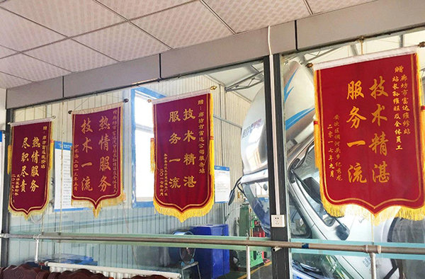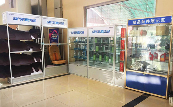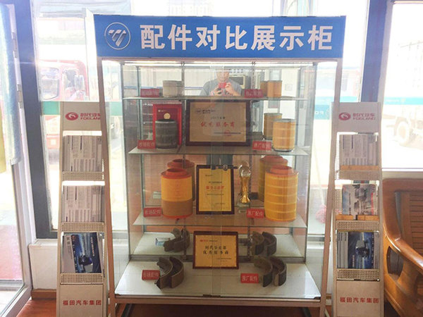 服务台后方的“全程无忧”标识,强调了企业对用户的承诺;沙发后方一面面锦旗证明了该服务站的服务能力;配件对比柜也向用户展示了原厂配件与副厂件的品质区别。