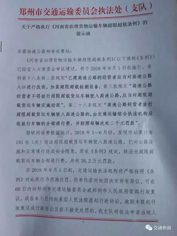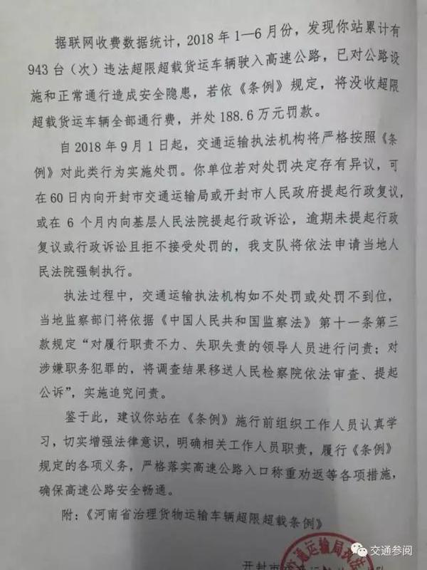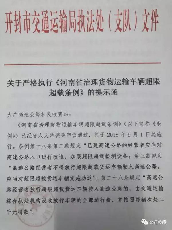 近日,河南多地高速收费站收到提示函,表示将要严格执行《河南省治理货物运输车辆超限超载条例》。其中大广高速公路杜良收费被通知,将没收其1-6月份超限超载货运车辆全部通行费,且对收费站罚款188.6万元。具体内容如下。