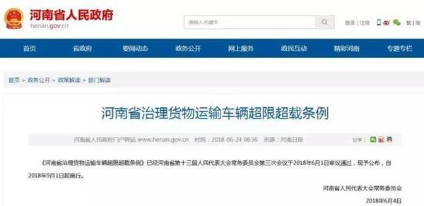 6月4日,河南省人民政府公布消息,表示《河南省治理货物运输车辆超限超载条例》已经河南省第十三届人民代表大会常务委员会第三次会议于2018年6月1日审议通过,现予公布,自2018年9月1日起施行。并且,公布了《河南省治理货物运输车辆超限超载条例》的具体内容。