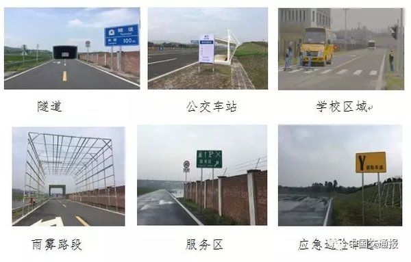 部公路院采用改造和临时搭建的形式,通过布置标线、标识、标牌、可移动信号灯、目标车、目标人等设施,可构建各种不同形态、不同规模的道路交通场景、前方事故预警等多场景的自动驾驶测试需求。