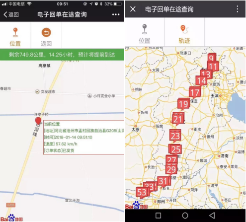 物流源电子回单直接满足了发货方、承运方、收货方对货物在途管控方面等需求。在货物跟踪方面,电子回单能够反馈货物的实时位置及当前运行状态(如当前行驶速度、剩余里程、剩余时间等),能够清晰记录货物运输的全程轨迹。用户可以通过微信实现自主查询货物实时位置,知晓货物运行状态,了解货物运行轨迹等。