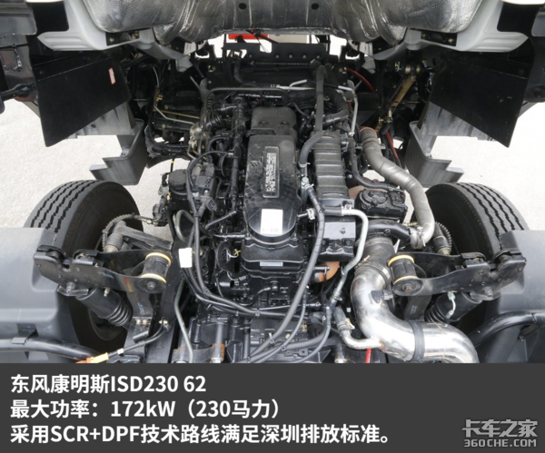 动力配置方面是该车的一大特点,搭载东风康明斯ISD230 62的230马力发动机,这对于一款轴距5.8米的中卡来说,动力是绝对够用的,可满足大部分的运输工况,最重要的是采用了SCR+DPF后处理系统,满足深圳排放政策,上深圳牌无忧。