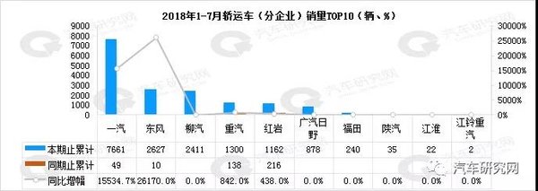 一汽销量高居榜首,1-7月累计销量为7661辆,同比增长15534.7%,其次为东风、柳汽、重汽和红岩,销量分别为2627辆、2411辆、1300辆和1162辆,其次为广汽日野、福田、陕汽、江淮和江铃重汽,几家销量均不足千辆。