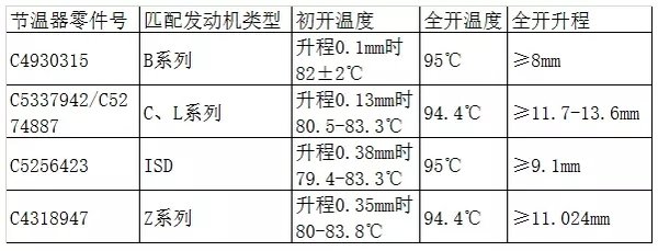 一旦温度达到或超过主阀门全开温度,主阀门全开,而副阀门正好全部关闭小循环通道,这时的散热能力将最大限度的发挥,从而保证柴油发动机机在最佳温度范围内运转。不同发动机的节温器额定工作温度也是不同的,下表就是康康提供给各位卡友的“康机”常备节温器的工况数据: