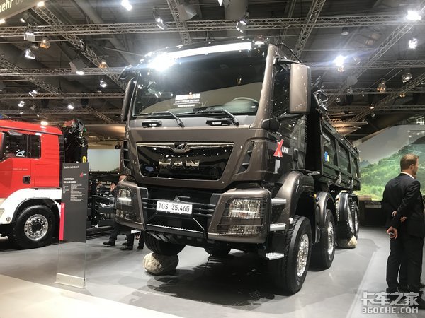 这辆车乍一看以为8x4的载货车,但是通过展台我们才发现这辆车是一辆8x6的自卸车,其中三桥都具有驱动能力。比起国内常见的8x4来说,这辆车具有更强的通过能力,可以更好地适应泥泞道路。