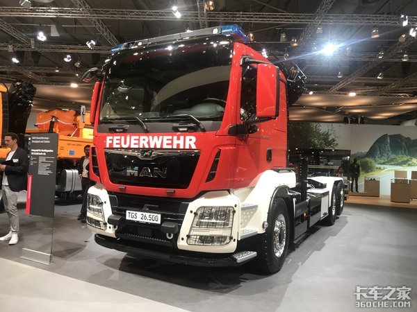在国内我们经常可以看到采用曼作为底盘的消防车,这辆车采用的是TGS的驾驶室,但是发动机最大竟然可以输出500马力。作为消防车,采用了经典的红色涂装,在展台中非常显眼。