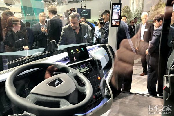 进入驾驶室,我们可以看到这款车的方向盘还是采用经典的德国曼四幅方向盘,中间的“天降雄狮”还是那么威武。而驾驶室里的数字化显示屏非常丰富,多块高科技显示屏为这款车的科技含量加分不少,显然这款车定位于自动化驾驶的趋势。