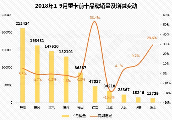 重卡前十强依次是解放、东风、重汽、陕汽、福田、红岩、江淮、大运、华菱、徐工。其中,解放1-9月累计销量达21.24万辆,是唯一一家超过20万的重卡厂家。