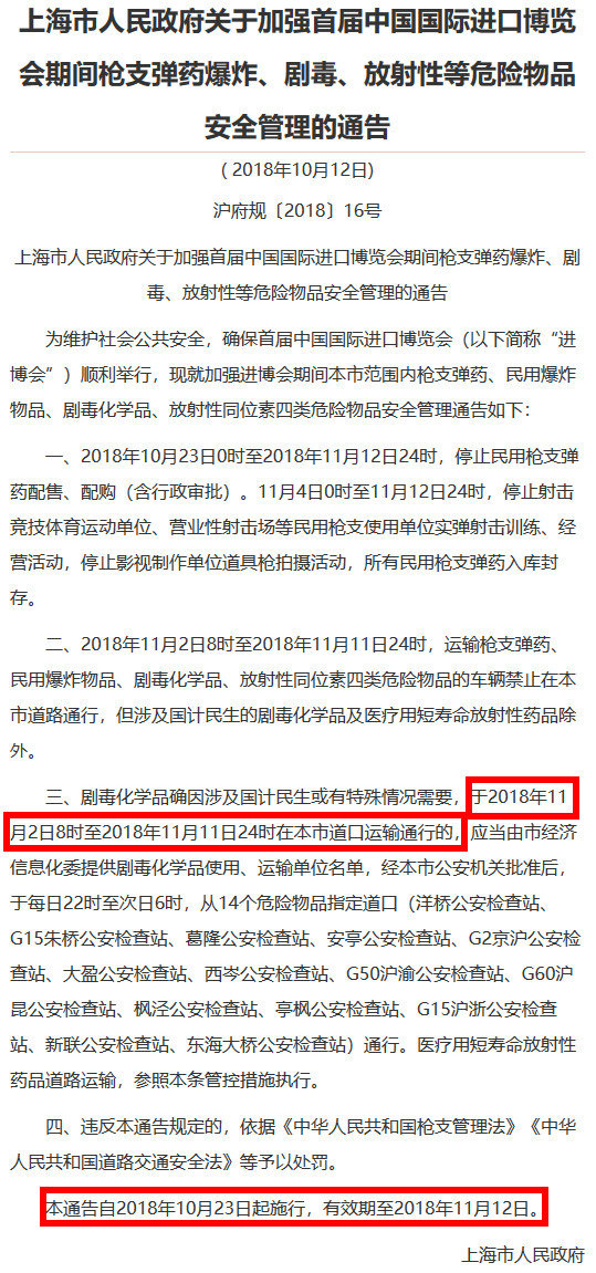 根据上海市各级政府的要求和布署,进口博览会期间,道路危险化学品运输车辆自11月2日至11月12日禁止营运。请有涉及到危险品进出口的朋友们务必注意,为了您的业务不受影响,请提前做好充足订单计划、安排生产、发货!