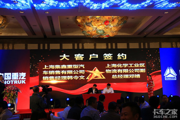 发布会现场,上海集鑫重型汽车销售有限公司销售经理韩令文与上海化学工业区物流有限公司副总经理邓靖、上海集鑫重型汽车销售有限公司卡车部经理王洪与上海祥祝土石方工程有限公司总经理王洪广,在各位到场的领导以及用户的见证下进行签约仪式。