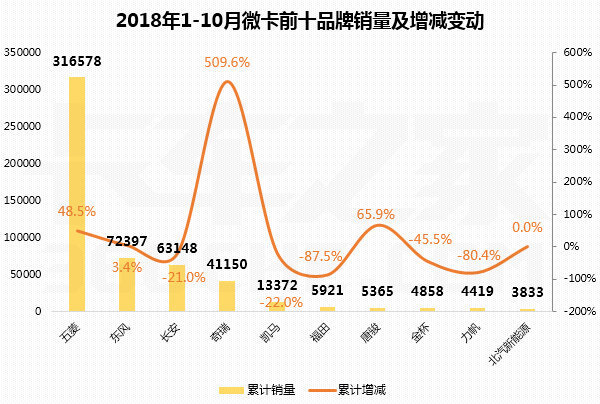 以群众基础雄厚,在民间拥有“五菱神车”美誉的上汽通用五菱为例,五菱在微卡市场占据近6成的市场份额,拥有绝对的优势。10月份五菱微卡销量达到3.5万,同比增长100.7%;1-10月五菱销量31.7万辆,同比增幅48.5%——可以说,微卡市场的增长结果绝大多数都得益于五菱微卡在市场上的良好表现。