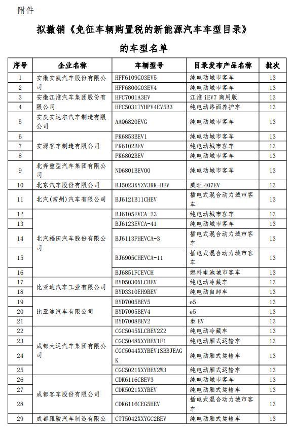 附:拟撤销《免征车辆购置税的新能源汽车车型目录》的名单