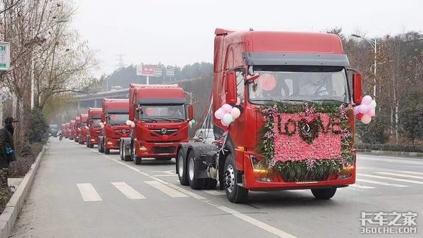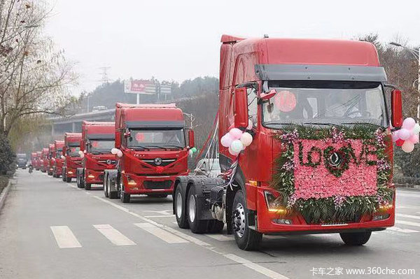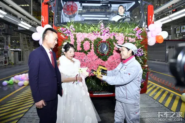 上午10点,王泽梁扶着洪丹踏上了用玫瑰装点的东风天龙KL婚车,随着彩花在天空中绽放,10辆天龙KL组成的迎亲车队在浓郁甜腻的爱情氛围中驶出了重卡新工厂。