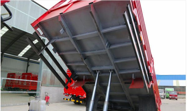 在使用上,货箱亦可以成为普通的栏板车,将栏板打开拆掉立柱,则可以变成平板,以方便运输一些尺寸较大的物品;亦可以成为普通的自卸车,从而方便用户在不同的运输场景当中,都能够游刃有余。