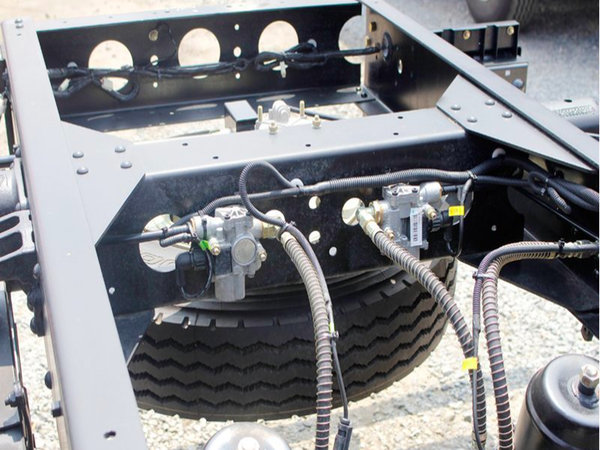 液压举升系统采用中置双杠110,举升的重量更大也更加稳定。举升的角度最大可以达到55度,更方便用户卸货,尤其是运输介质为黏土时能够将货物全部卸掉。操作举升机构的时候切记一定要将车辆停在平整的路面上,并且观察上方是否有电线等。