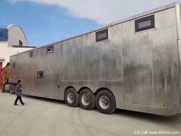 从外观上来看经过了全方位的改装,外围采用钢板进行全包围,挂车前方安装了空调及走线布局,挂体上设有了零散的几个小窗,这辆挂车到底是干什么的?别急,我们继续往下看。