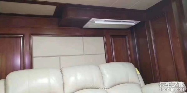 总的来说挂车内部分为了休息区、商务会客区、办公区、厨房区和卫生区。商务会客区的装修风格同样以实木为主,后方的拼接衬板装饰与真皮软质沙发的搭配简约而不简单。