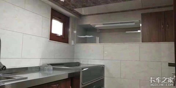 厨房区的装修风格以瓷砖为主,其好处就是清理方便,并且内部的碗柜、案台、油烟机等设施一应俱全,并且在侧方还设有了小窗。这辆挂车目前还未装潢完毕,可以见得车主是一个极其热爱生活的人。