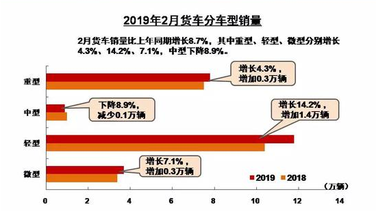 通过分析2月份的数据,卡车整体销量同比增长8.7%,轻型卡车增幅最大,达14.2%。但一月、二月并非传统的行业旺季,也许只有待“金三银四”之后,2019年卡车行业的走向才能方现端倪。