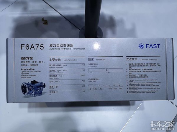 F6A75液力自动变速器、F6A45液力自动变速器是法士特针对轻卡市场推出了6挡轻型液力自动变速器。重量轻、结构紧凑、操作舒适,对于在国内呈垄断局面的国外品牌也形成了很强的冲击力。