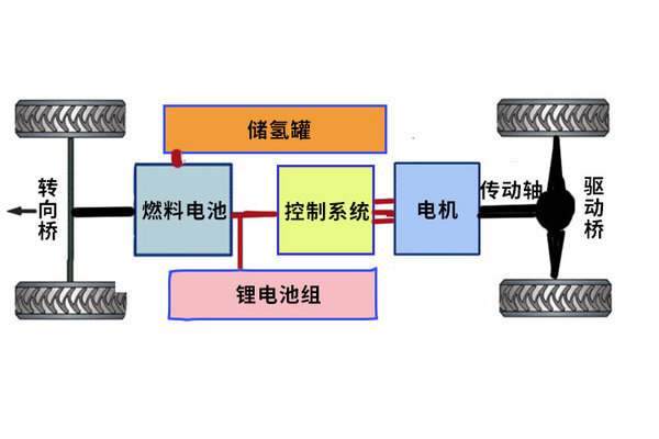 燃料电池发出的电,经逆变器、控制器等装置,给电动机供电,再经传动系统、驱动桥等带动车轮转动,就可使车辆在路上行驶。