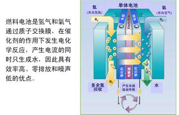 氢燃料电池车的工作原理是:将氢气送到燃料电池的阳极板(负极),经过催化剂(铂)的作用,氢原子中的一个电子被分离出来,失去电子的氢离子(质子)穿过质子交换膜,到达燃料电池阴极板(正极),而电子是不能通过质子交换膜的,这个电子,只能经外部电路,到达燃料电池阴极板,从而在外电路中产生电流。