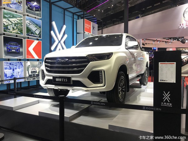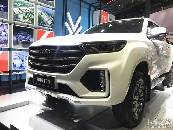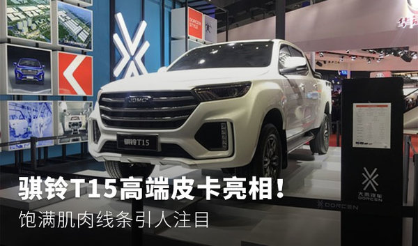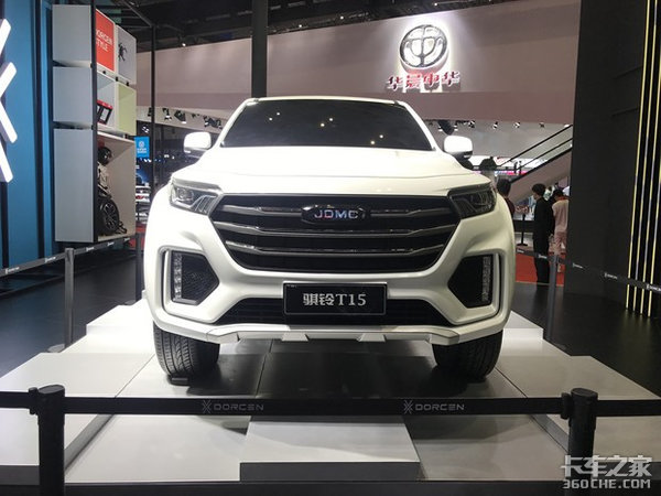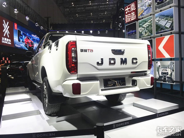 从展会上的照片中可以看出,骐铃T15的外观肌肉感十足,棱角分明的线条充满力量感。进气格栅采用了大尺寸设计,两侧的贯穿一体式大灯造型锐利,动感十足。硬朗造型和流线型风格使它的外观更具辨识度,中网及尾门处的“JDMC”的全新Logo十分亮眼。