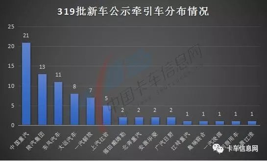 4月18日工信部公示了申报第319批《道路机动车辆生产企业及产品公告》新产品,据统计,本批新车公示中共有78款牵引车。