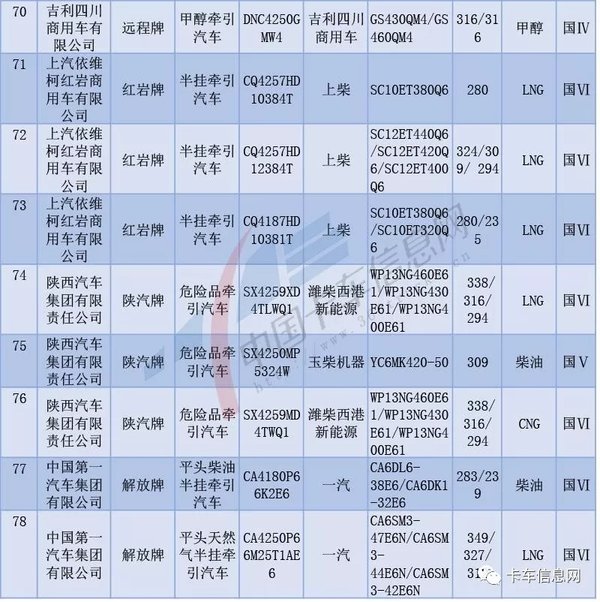 从排放标准来看,此次申报的78款牵引车新品中,72款车满足国六排放标准;4款车为国五排放,这4款车全部为柴油车,分别是广汽日野的2款车,重汽1款,陕汽1款;还有1款国四车,是吉利四川商用车的甲醇车。