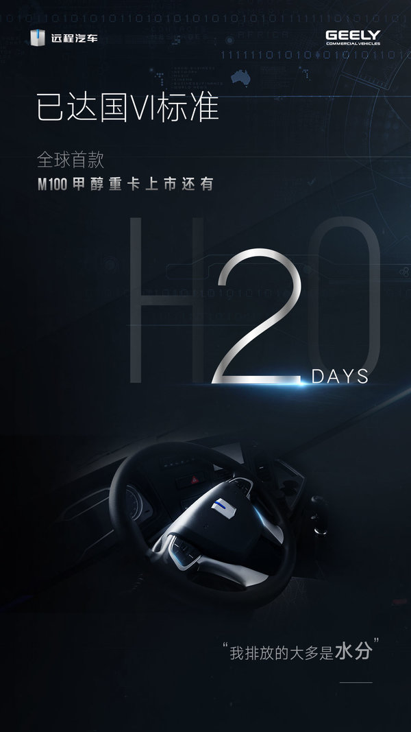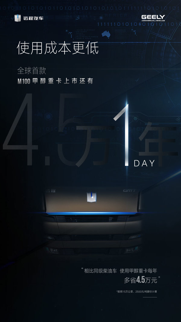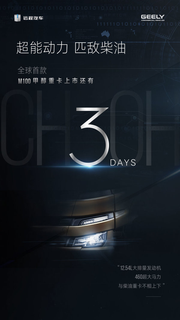 2019年4月26日,吉利远程汽车将推出全球首款M100甲醇重卡,其拥有的12.54升排量发动机功率达到460马力,动力与普通的柴油重卡不相上下。