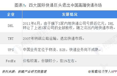 在高端快递市场中,一开始国际快递巨头占有了大部分的市场份额,但随着国际快递巨头相继退出中国市场,高端快递市场出现了较大空白。国际四大快递中,目前只有联邦快递在运营国内快递业务,市场份额约占1%。