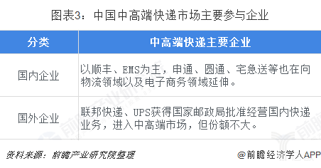 根据业务层次不同,国内快递主要可以分为高端快递、中高端快递和普通快递件。其中,高端快递是要在消费者指定的时间范围内及时送到指定地点,中高端快递主要提供次晨达、即日达这一类递送时间短的业务,普通快递件则包括国内经济快递及快递包裹。