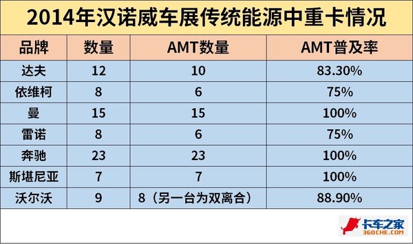 2014年德国汉诺威车展,欧洲7大卡车公司共展出传统能源(柴油、天然气)中重型卡车82台,搭载AMT变速箱的有75台,双离合变速箱1台。