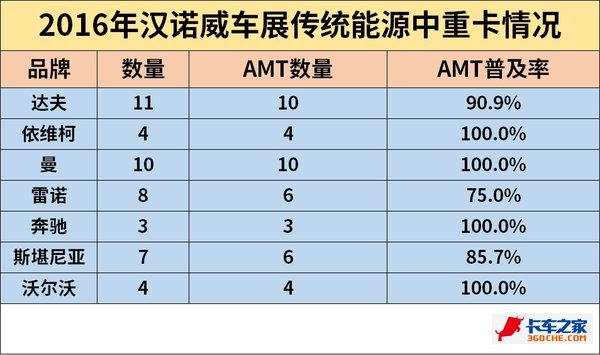 2016年德国汉诺威车展,欧洲7大卡车公司共展出传统能源(柴油、天然气)中重型卡车47台,搭载AMT变速箱的有43台。