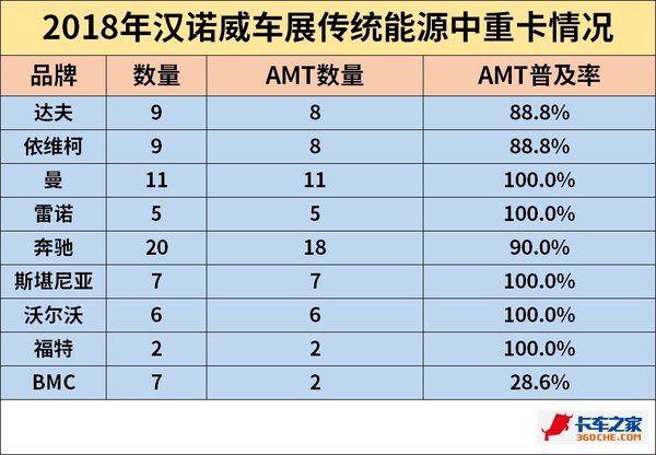 2018年德国汉诺威车展,欧洲卡车品牌除了7大卡车公司外,还有土耳其的BMC和福特,共展出传统能源(柴油、天然气)中重型卡车76台,搭载AMT变速箱的有67台。