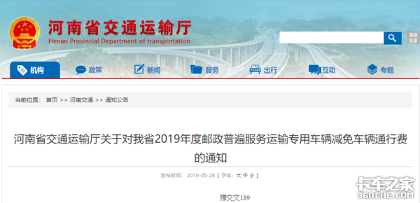日前,河南省交通运输厅下发《关于对我省2019年度邮政普遍服务运输专用车辆减免车辆通行费的通知》,明确提出免收本省籍邮政普遍服务运输专用车辆半年的通行费。