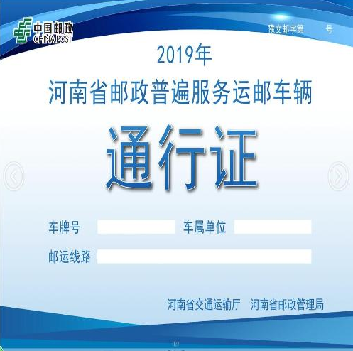 河南省邮政普遍服务运邮车辆通行证样式: