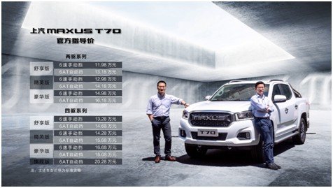 上汽大通汽车有限公司总经理王瑞(右)、上汽大通汽车销售服务有限公司总经理郑轶民(左)、及上汽大通MAXUS T70官方指导价