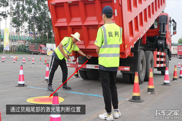 最后倒入始发库,举起货厢,通过安装在货厢后的激光笔,照射地面得分牌获得分数。由于尾部几乎属于盲区,观察视野受到一定限制,需参赛选手有一定的预判能力,来计算出货厢升起来后的角度。显然,对于经验丰富长期驾驶自卸车的选手来说,并不是难题。