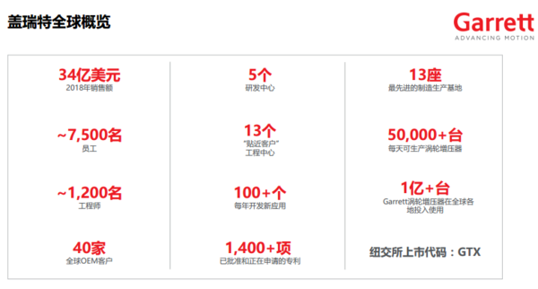 盖瑞特(Garrett-AdvancingMotion)是汽车行业的技术领导者,开拓涡轮增压技术六十多年的先行者和发明者,更是引领先进动力总成技术和智能网联技术的创新者。盖瑞特公司前身为霍尼韦尔航空航天集团交通系统业务部,于2018年10月1日从霍尼韦尔分拆独立,成为一家上市企业,纽交所代码:GTX。