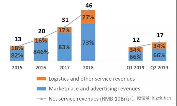 京东集团发布的2019年Q2财报显示,整个集团净收入为1503亿元,其中净服务收入达到168亿元人民币,以开放物流业务为代表的物流及其他服务收入同比增长98%,继续保持在90%以上,高于总收入增速。