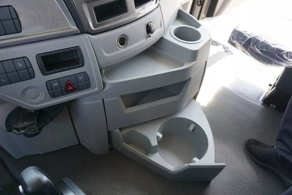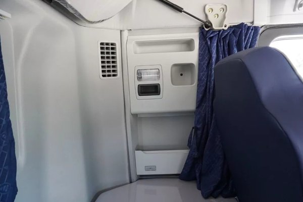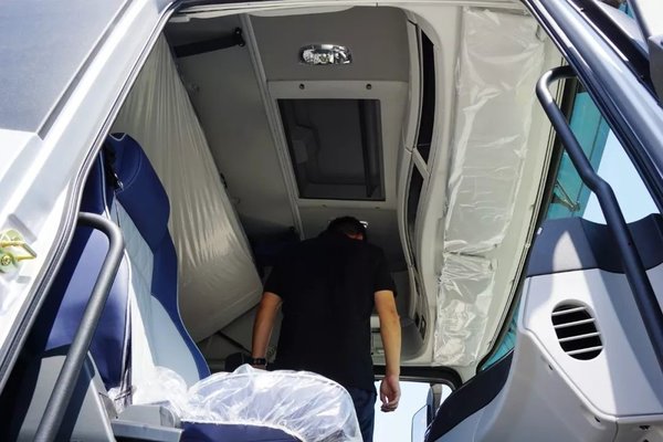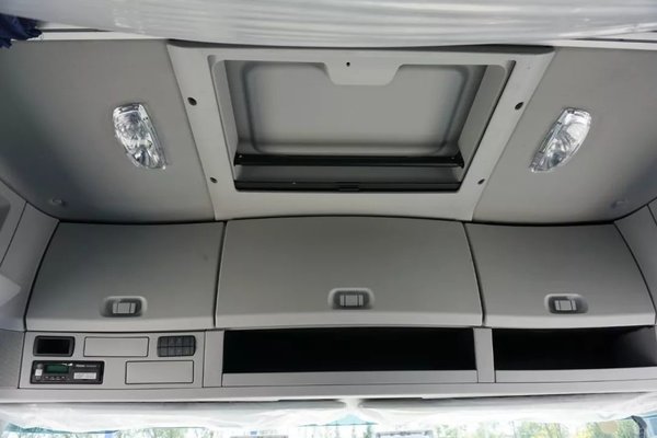 浅色内饰,四级登车踏板,驾驶室顶部配有电动天窗,带有纱窗,停车休息比较方便,驾驶室内部灯光全面升级了LED光源。