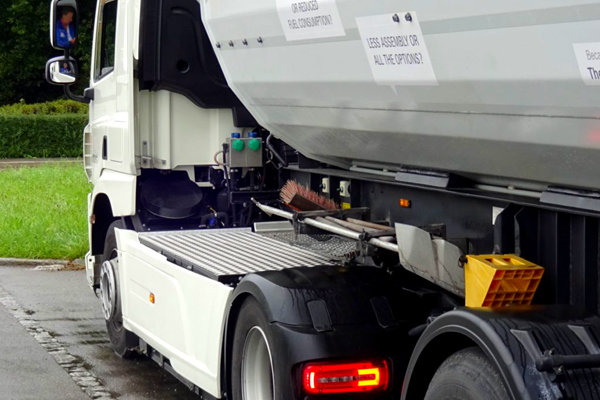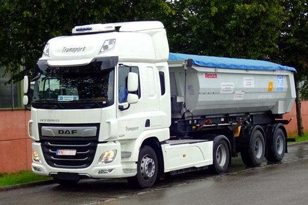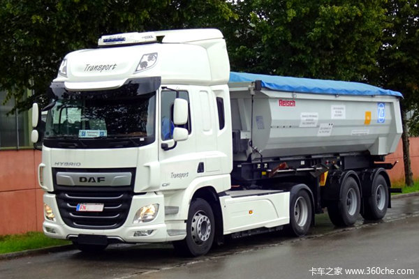 【卡车之家 原创】近日,有欧洲卡友在德国腓特烈港拍到了一款达夫CF混合动力卡车。这款达夫CF牵引着一辆两轴自卸挂车,据说是在做测试,而这款车属于采埃孚公司。