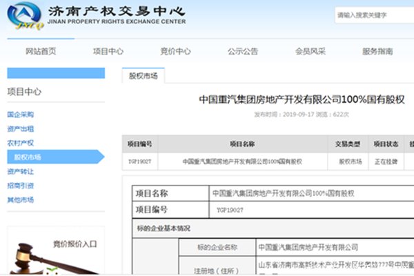 9月17日,中国重汽集团房地产开发有限公司(简称“重汽地产”)100%股权在济南产权交易中心挂牌转让,标志着中国重汽集团房地产板块的剥离工作拉开序幕。