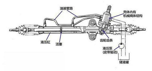 液压助力转向系统主要组成部分有液压泵、油管、压力流体控制阀、V型传动皮带、储油罐等。