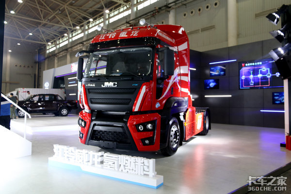 江铃展台上只出现了两款重型卡车,一款是威龙HV5高配牵引车,一款是老款威龙驾驶室的氢燃料牵引车。威龙HV5与福特F-MAX同宗,装配了福特发动机,具有430马力和470马力两种动力选择,变速箱则是采埃孚AMT变速箱,后桥采用气囊悬架,整车匹配多项安全辅助设施,其品质和做工不亚于欧洲进口车。