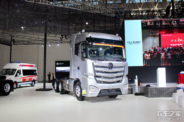 福田展台共有5台中重型卡车,欧曼展出了两款EST牵引车,其中一款为EST-A牵引车,510马力,搭载的是采埃孚AMT变速箱;另外一款为普通版本欧曼EST牵引车,560马力,匹配手动变速箱。