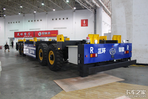 我们之前见过解放的港口集装箱运输车,这次在武汉车展上,我们见到了三环十通也展出了一款类似的车型,这款车采用4轴底盘,没有驾驶室,其承载平台用来运输集装箱。自动、智能、无人驾驶,这类车是助力智能化、数字化港口运输的利器。