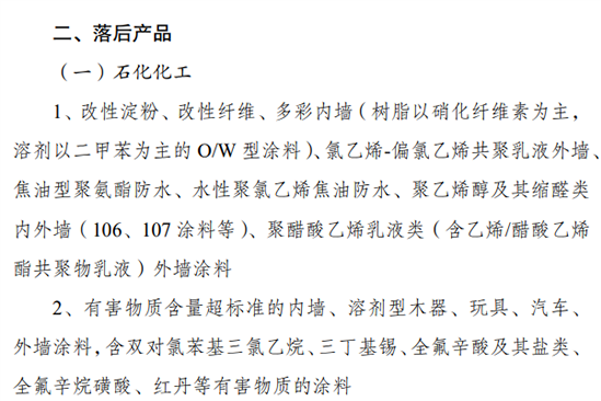 在淘汰类落后产品石化化工中提出,淘汰有害物质含量超标准的汽车、玩具等,包含双对氯苯基三氯乙烷、三丁基锡、全氟辛酸及其盐类、 全氟辛烷磺酸、红丹等有害物质的涂料。